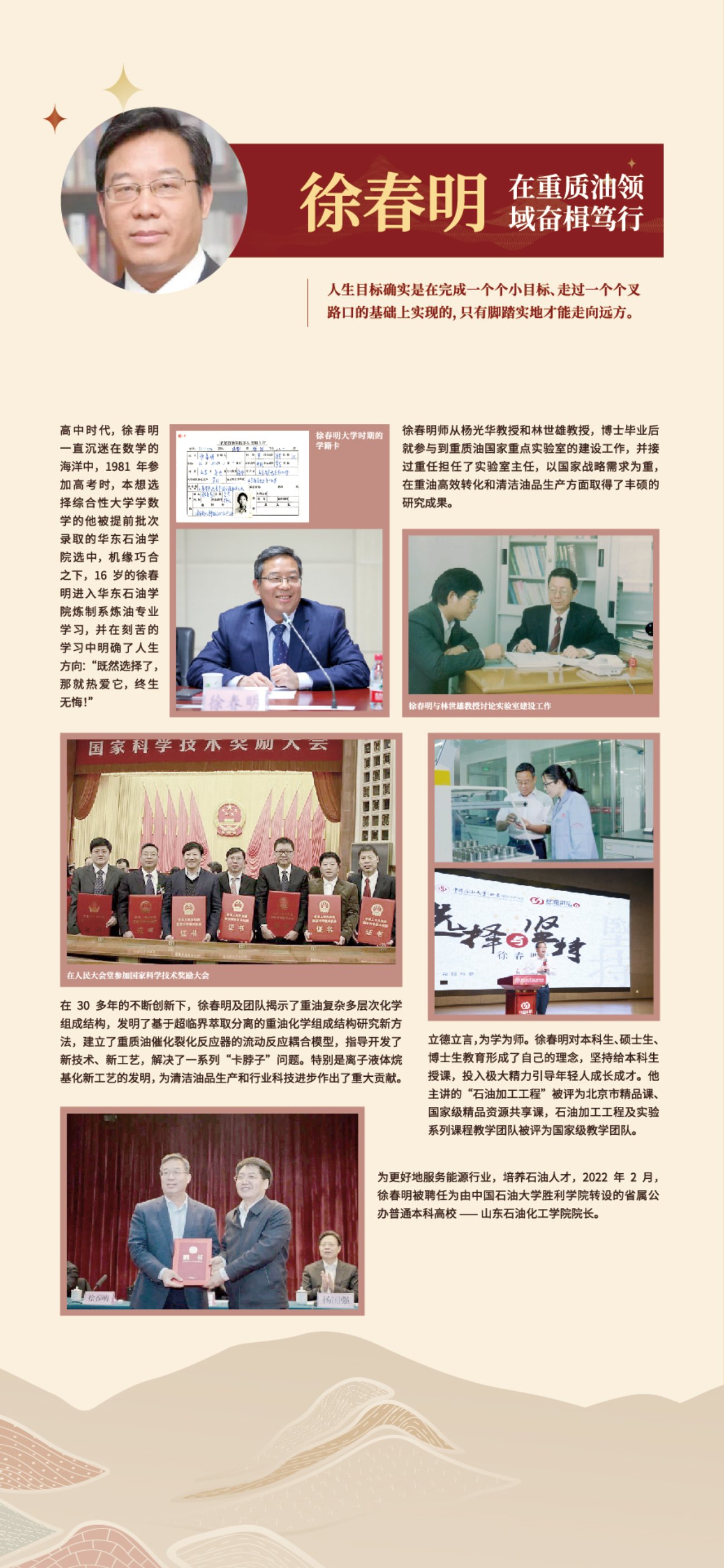 1981年考入华东石油学院炼制系,获得石油大学(北京)硕士和博士学位后留校任教。现为中国化工学会副理事长,中国石油大学(北京)重质油国家重点实验室主任、碳中和联合研究院院长、碳中和未来技术学院院长,山东石油化工学院院长。