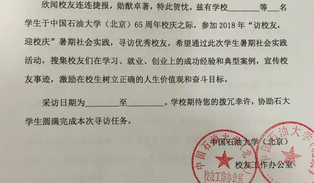 为庆祝建校65周年,进一步加强与校友的联络,凝聚校友力量,引导和鼓励石大学子在社会实践中受教育、长才干、做贡献,激励大学生立志成才,石大组织开展“访校友,迎校庆”寻访优秀青年校友暑期社会实践活动。