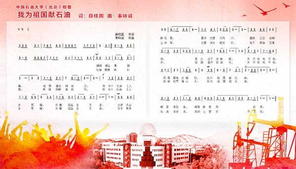他指出,校歌是凝练、承载大学文化的重要符号,是一所学校深层次精神底蕴与人文内涵的集中体现,沉淀着学校的办学理念和办学特色。在65周年校庆倒计时100天的日子里,学校将薛柱国作词、秦咏诚作曲的《我为祖国献石油》正式作为校歌发布,是献给石大65周年华诞的一份厚礼。他希望广大师生继续发扬石大的优良校风,秉承石油传统,实事求是,艰苦奋斗,爱国奉献,开拓创新,在新时代共同谱写建设石油石化学科领域世界一流研究型大学的新篇章。