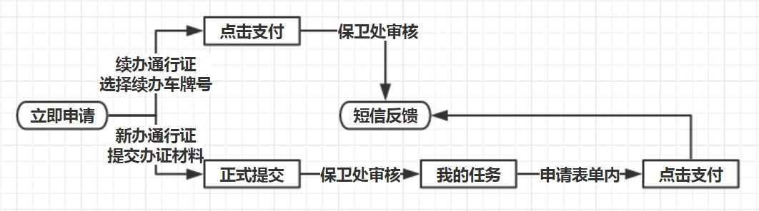“办理业务”选择“新办通行证”,完善信息并提交办理材料,由保卫处审核后再缴费。