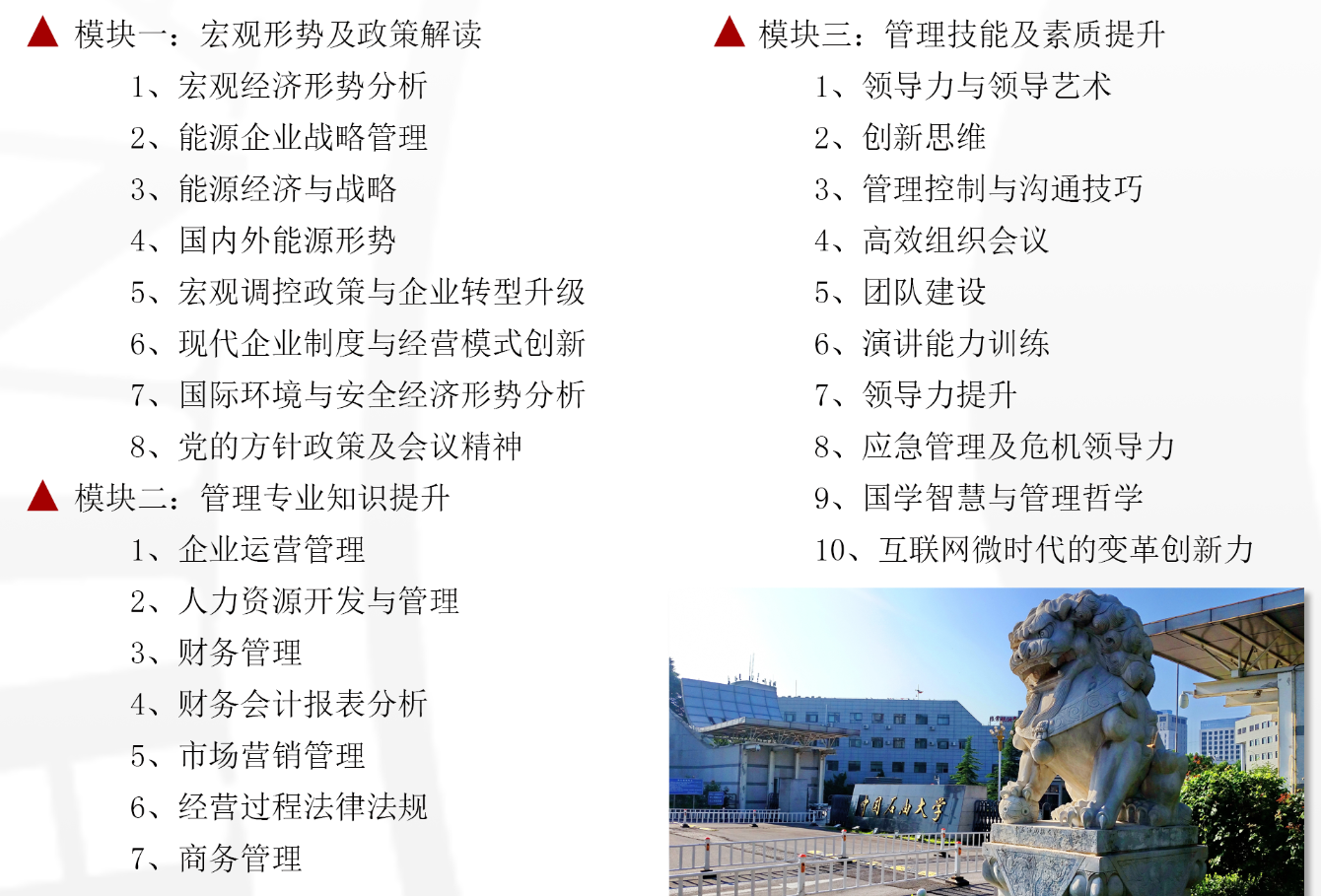 项目涉及宏观经济形势分析及国家政策解读、管理专业知识提升、管理技能及素质提升、案例研讨等环节。项目紧跟时代发展需求,契合国内外政策形势与企业实际状况,提高参培人员的管理技能和管理能力,为企业培养高素质的管理者队伍。