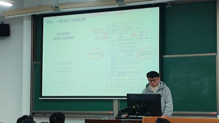 “规范入门——入党文书的写作要求”部分,环工本科党支部学生书记王文紫瑶系统讲解了入党申请书、思想汇报、群众调查意见、政治审查函调及自传等核心文书的书写格式与内容要点。能化本科党支部学生书记钮缨雪则聚焦《入党积极分子考察表》,围绕基本信息、家庭成员、培训经历等填写项目提供详细操作指引,为学员规范撰写入党材料奠定基础。