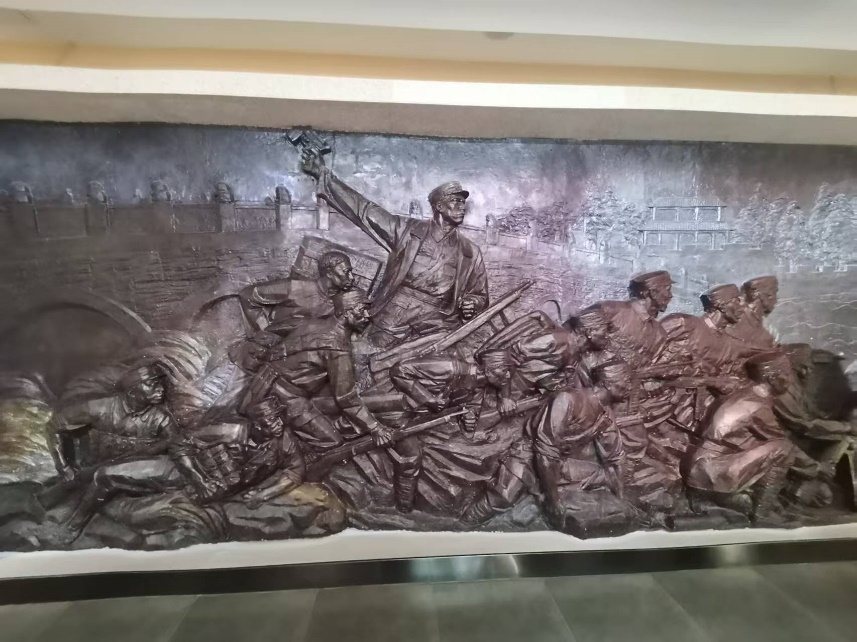 展厅内的文物丰富而震撼,锈迹斑斑的步枪、布满弹孔的军帽、泛黄的书信手稿,每一件文物都承载着一段刻骨铭心的记忆。其中,一组“七七事变”场景复原展区令人尤为动容:模拟的宛平城城墙下,士兵们紧握武器坚守阵地,背景中炮火连天的投影与激昂的呐喊声交织,生动再现了当年中国军人浴血奋战的壮烈场面,让每位同志真切感受到了先烈们为民族独立不惜牺牲的崇高气节。