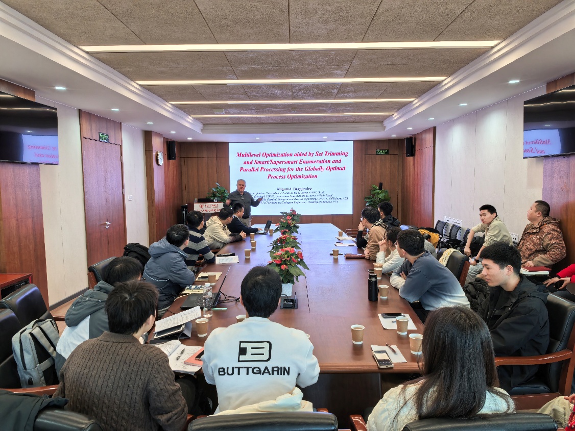 2025年12月9日上午,美国俄克拉荷马大学Miguel J. Bagajewicz教授应邀做客中石大“海风讲坛”,作题为《面向过程工业全局优化的集合修剪-智能枚举-并行处理辅助多层次优化方法》(Multilevel Optimization aided by Set Trimming and Smart/Supersmart Enumeration and parallel processing for the Globally Optimal Process Optimization)的学术报告。讲坛由化学工程与环境学院邓春副院长主持,重庆大学常承林副教授,化工学院王彧斐教授,陈毓秋教授及相关学生参加。