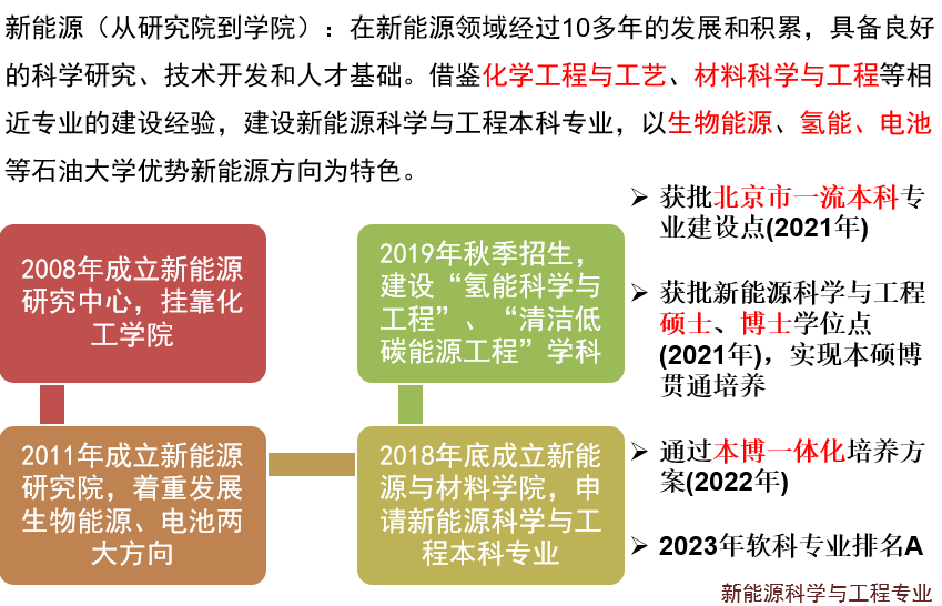 基于对能源行业发展趋势的判断和思考,中国石油大学立足国家能源战略需求和学科发展前沿布局,2018年在原新能源研究院的基础上,成功申办新能源科学与工程专业,2019年第一次招收本科生70人。2020年获批新能源科学与工程交叉博士学位点,2021年获批新能源科学与工程硕士学位点,实现新能源方向本、硕、博全方位培养。2021年,新能源科学与工程本科专业入选北京市一流专业建设点。2022年,通过新能源本博一体化培养方案。2023年软科新能源专业排名A。2024年与经管学院合办能源经济与新能源工程双学士学位专业。