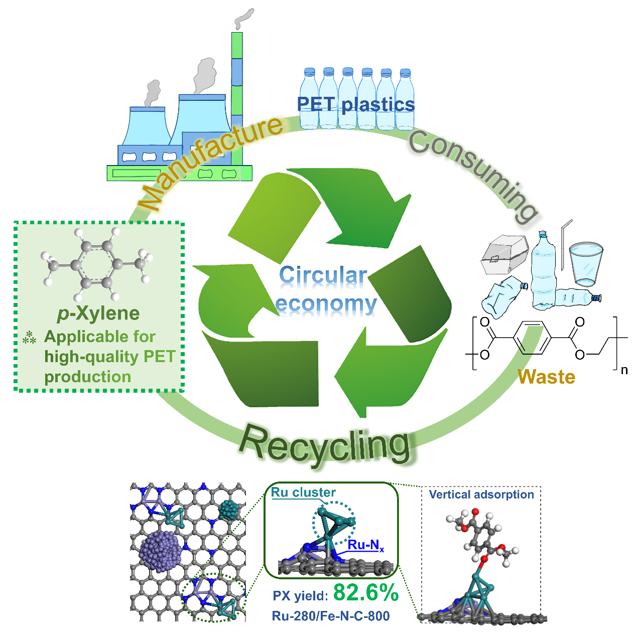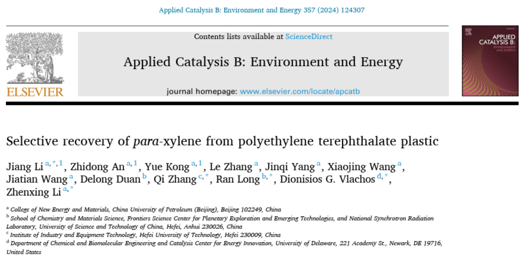 近日,在国家重点研发计划,国家自然科学基金等支持下,awc77万象城官网新能源与材料学院李江副教授/李振兴教授研究团队联合合肥工业大学张琪副教授,中国科学技术大学龙冉教授以及美国特拉华大学能源创新催化中心Dionisios G. Vlachos教授在塑料降解领域取得重要研究进展。团队发展了一种高选择性RuFe双金属催化剂用于一种PET的模型化合物DMT和实际PET塑料的加氢脱氧过程,成果发表在《Applied Catalysis B: Environment and Energy》上(Appl. Catal. B Environ., 2024, 357, 124307),题目为:“Selective recovery of para-xylene from polyethylene terephthalate plastic”。论文第一作者为新能源与材料学院李江副教授,新能源与材料学院博士研究生安志东和硕士研究生孔悦为共同第一作者,awc77万象城官网为第一完成单位。