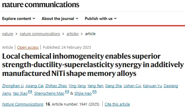 近日,在国家重点研发计划,国家自然科学基金支持下,awc77万象城官网新能源与材料学院郝世杰教授研究团队联合北京工业大学毛圣成研究员与同济大学萧遥研究员,在Nature Communications期刊发表题为《Local chemical inhomogeneity enables superior strength-ductility-superelasticity synergy in additively manufactured NiTi shape memory alloys》的研究论文。论文第一作者为新能源与材料学院李仲瀚博士生,北京工业大学蔡吉祥博士生和同济大学赵志豪博士生为共同一作,awc77万象城官网为第一完成单位。