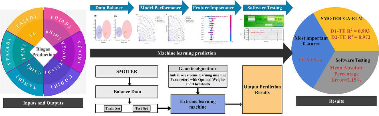 针对工业沼气厂参数的高度非线性和不平衡问题,我们提出了一种混合极端学习机模型(SMOTER-GA-ELM),通过将机器学习技术与数据平衡技术和优化算法相结合,可解决不平衡数据来实现了对不同负荷下工厂沼气产量的准确预测。相关成果开发成软件助力湿式厌氧工厂高效产沼气 (软著号:2022SR0903828),并以“Plant-scale biogas production prediction based on multiple hybrid machine learning technique”为题,于2022年9月在国际知名学术期刊Bioresource Technology上发表。论文链接:https://doi.org/10.1016/j.biortech.2022.127899.