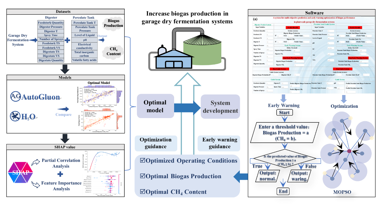 针对工业规模车库干发酵系统具有极强非线性的问题,我们提出了一种新型机器学习智能系统,它采用两种自动机器学习算法(AutoGluon和H2O)进行沼气性能预测,并采用SHAP进行可解释性分析,同时采用多目标粒子群优化对工业规模车库干发酵进行预警指导,为下一代智能工业系统铺平了道路(软著号:2023SR0452517)。相关成果以“Novel intelligent system based on automated machine learning for multi objective prediction and early warning guidance of biogas performance in industrial-scale garage dry fermentation”为题,于2023年5月在国际知名学术期刊ACS ES&T Engineering上发表。论文链接:https://doi.org/10.1021/acsestengg.3c00079.