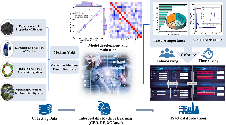 此外,我们开发了基于树的机器学习模型来描述生物炭特性与厌氧消化之间的复杂关系,通过特征可解释技术对生物炭对厌氧消化的影响提出了新的见解,并开发一项软件助力生物炭厌氧消化的性能预测(软著号:2022R11L2047794)。相关成果以“Tree-based machine learning model for visualizing complex relationships between biochar properties and anaerobic digestion”为题,于2023年2月在国际知名学术期刊Bioresource Technology上以当期封面论文的形式发表。论文链接:https://doi.org/10.1016/j.biortech.2023.128746.