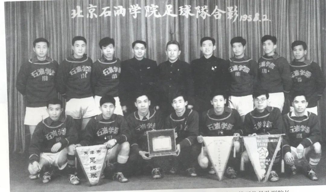 1958年,时任北京石油学院副院长曹本熹、孙卓夫与足球队合影