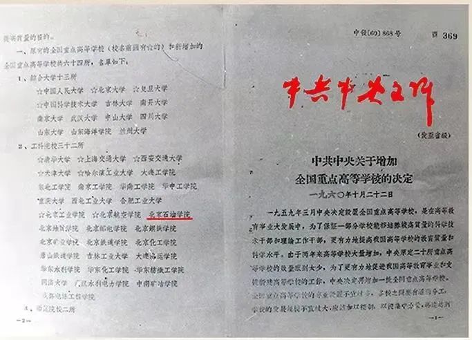 1960年10月22日,中共中央发布(60)868号文件,宣布将全国重点高等学校增加到64所,北京石油学院成为第二批44所重点高校之一,从此跻身全国重点高校行列。