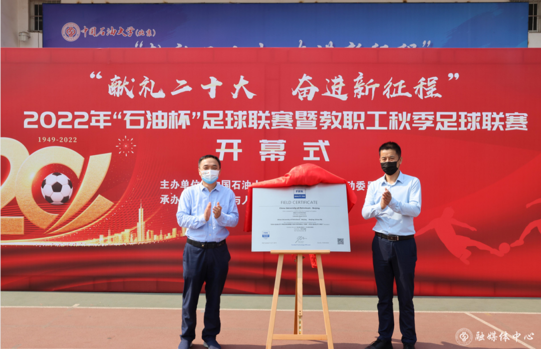 近日,学校“献礼二十大,奋进新征程”2022年“石油杯”足球联赛暨教职工秋季足球联赛在红旗操场开幕。中石大副校长张广清和体育与人文艺术学院负责人共同为红旗操场国际足联认证证书揭牌。师生足球友谊赛也火热开赛。