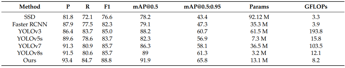 为了定量分析所提方法与其他方法的检测性能,在表1中给出了GDUT-HWD数据集上各项指标的实验结果。对比包括SSD、R-SSD、Faster RCNN、YOLOv3、YOLOv3-tiny、YOLOv4、YOLOv5s、YOLOv7s、YOLOv8s。以平均精度均值(mAP)评价指标为例,与其他方法相比,所提方法在5个类别中均取得了较高的检测精度。同时,在评估精度和F1分数时,所提出的方法与其他方法相比也在不同识别类别中提高了检测精度。如表2所示,在SHWD数据集上,当IoU阈值设置为0.5时,所提方法的检测准确率达到96.1%。在帽子类别和人类别上的准确率分别达到97.4%和94.9%。当IoU阈值在0.5 ~ 0.95之间时,mAP达到65.4%,比YOLOv5s提高了4.3%。为了进一步验证HR-YOLO的鲁棒性,在CUMT-HelmeT数据集上与SSD、Faster RCNN、YOLOv3、YOLOv5s、YOLOv7和YOLOv8s不同方法进行了对比实验。表3列出了不同方法的precision、recall、F1、mAP、Params和GFLOPs的值。从表中可以看出,与其他六种方法相比,我们的方法表现出最高的准确率、召回率、F1值、mAP@0.5和mAP@0.5:0.95。此外,在precision、recall、F1、mAP@0.5和map@0.5:0.95值上,与YOLOv5的结果相比,分别达到了3.8%、6.1%、5.1%、5.6%和7.7%的提升。