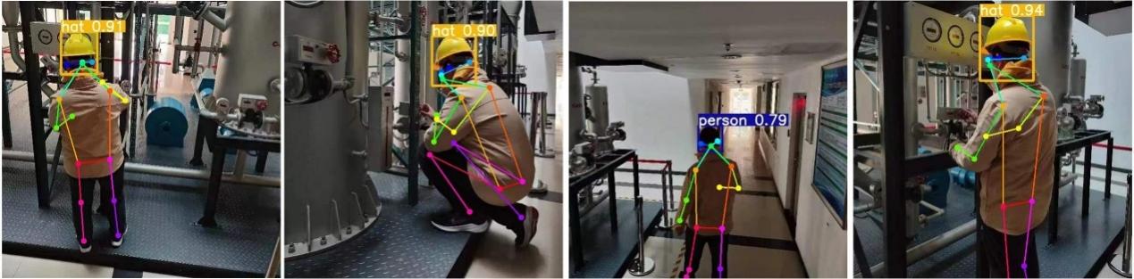 图6展示了HR-YOLO在室内场景中的应用。在加油站,工人经常在密集的管道附近工作,部分设备的形状类似于安全帽。实验结果表明,该方法能够有效地检测出复杂室内场景下安全帽佩戴情况。