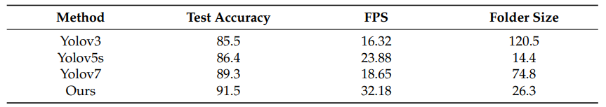 表4比较了不同方法得到的四足机器人系统头盔检测分类结果。文件夹大小是指所有配置文件的总大小,使四足机器人系统能够独立运行检测程序。HR-YOLO的测试精度和FPS最高,同时其文件夹大小仍在可接受范围内。