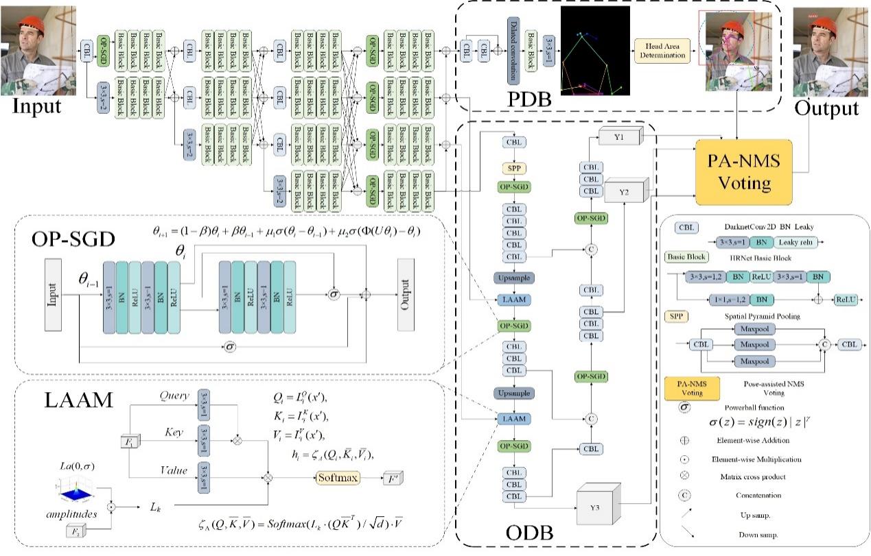 为了实现多尺度目标检测,构建了一个多分支并行融合网络HR-YOLO,如图1所示。原始图像大小为640 × 640 × 3,首先通过主干部分提取初步特征信息。这些特征传递给ODB,由ODB进一步提取和过滤特征,使用LAAM进行头盔目标检测。同时,PDB从初步特征中提取人体姿态特征,确定头部区域信息。最后,PA-NMS投票利用头盔物体特征和头部区域信息选择置信度和可靠性更高的边界框。通过这4种改进,HR-YOLO有效地识别小目标,并对安全帽佩戴进行合规性检测。