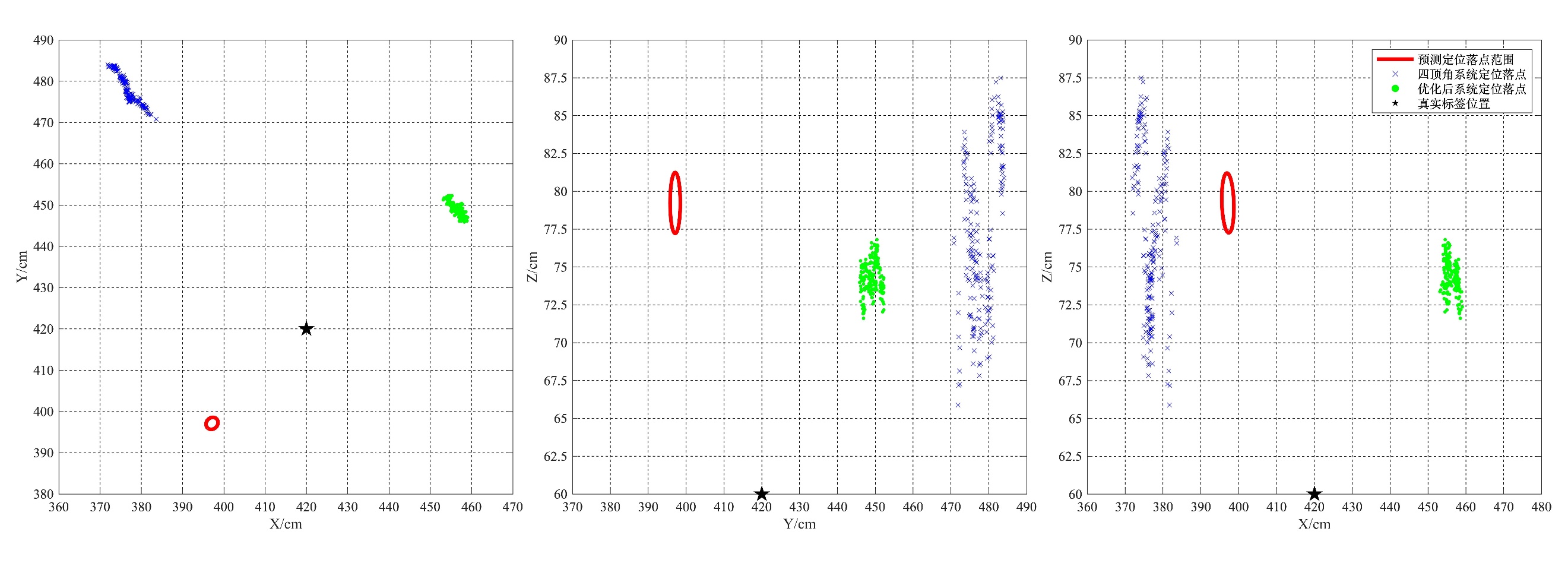 本节将四顶角定位系统、最优布局定位系统的实际定位效果与模型预测定位落点椭球进行对比分析,并绘制三维投影平面图如图3所示。由图可知,优化后的基站布局的定位落点更接近标签实际位置,系统的落点分布相对于四顶角系统更加紧密,四顶角系统的落点呈现偏移倾向,而优化后系统的落点更加稳定。