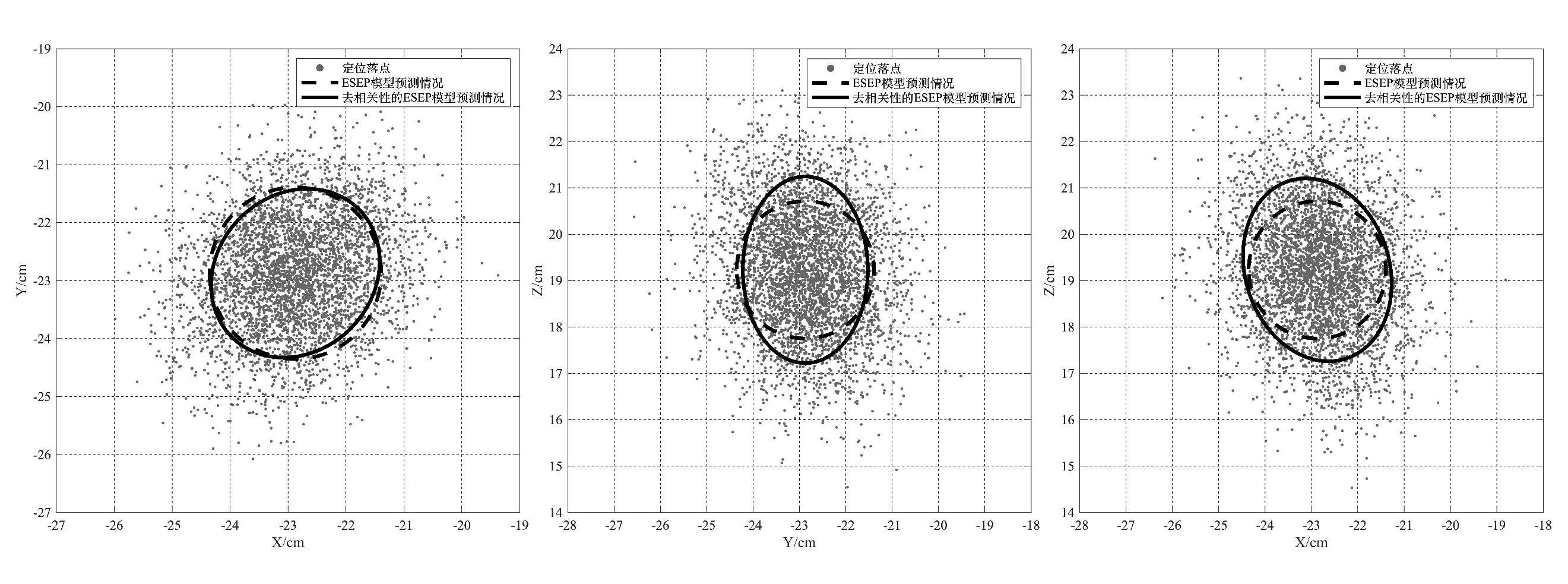 图1 OXY、OYZ、OXZ平面内理想定位落点与原始、去相关性预测椭球投影图