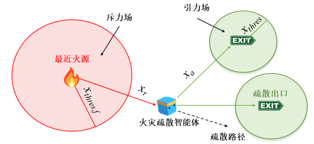 为了解决这些问题,本文提出了一种APF-DQN算法来规划到出口的疏散路径。APF-DQN 将人工势场方法融合到深度强化学习中,以计算最短疏散路径并同时保持与火灾点的安全距离。此外,APF-DQN能够在环境中的多个出口中自适应地选择合适的出口,并根据吸引力场和排斥力场的变化构造奖励函数,从而引导疏散引导智能体感知火灾的发展,选择合适的出口并规划疏散路线。
