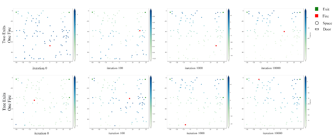 本文利用两种环境来测试我们提出的方法来验证算法的可扩展性,一种环境包含两个出口和一个火灾发生点,另一种环境考虑三个出口和一个火灾发生点。实验结果如图4所示,每个点表示空间内对应状态的Q值。颜色越深即Q值越高,意味着疏散引导智能体倾向于采取 Q 值较高的行动。在训练开始时,每个状态的 Q 值是不规则的,因此代理无法正确选择行动。在训练过程中,出口附近的状态具有较高的 Q 值,而环境中靠近火灾隐患的状态具有较低的值。因此,疏散代理能够在多个出口中自适应地选择合适的出口,同时远离远处的隐患。