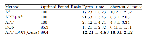 本文对两种经典路径规划方法 A-star 和 APF 进行了对比实验,如图6所示。在我们的实验中,对于每个代理,初始位置的差异会显着影响疏散时间步长和距离火灾的最近距离。因此,本文实验采取100次仿真,并计算平均距离和时间步长以消除误差。同时与传统强化学习算法DQN对比,如表1所示,APF-DQN具有最短的疏散时间和距离火灾危险最大的距离。