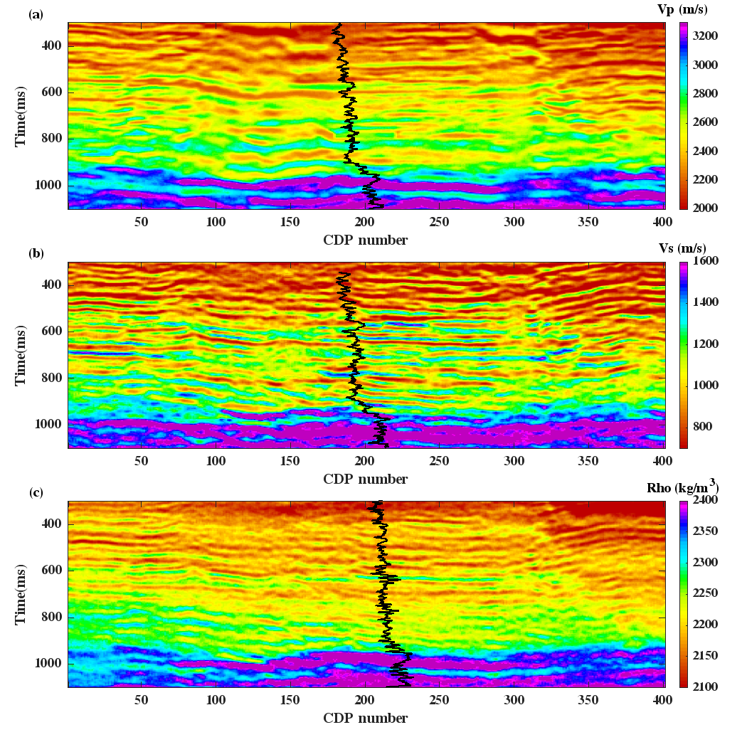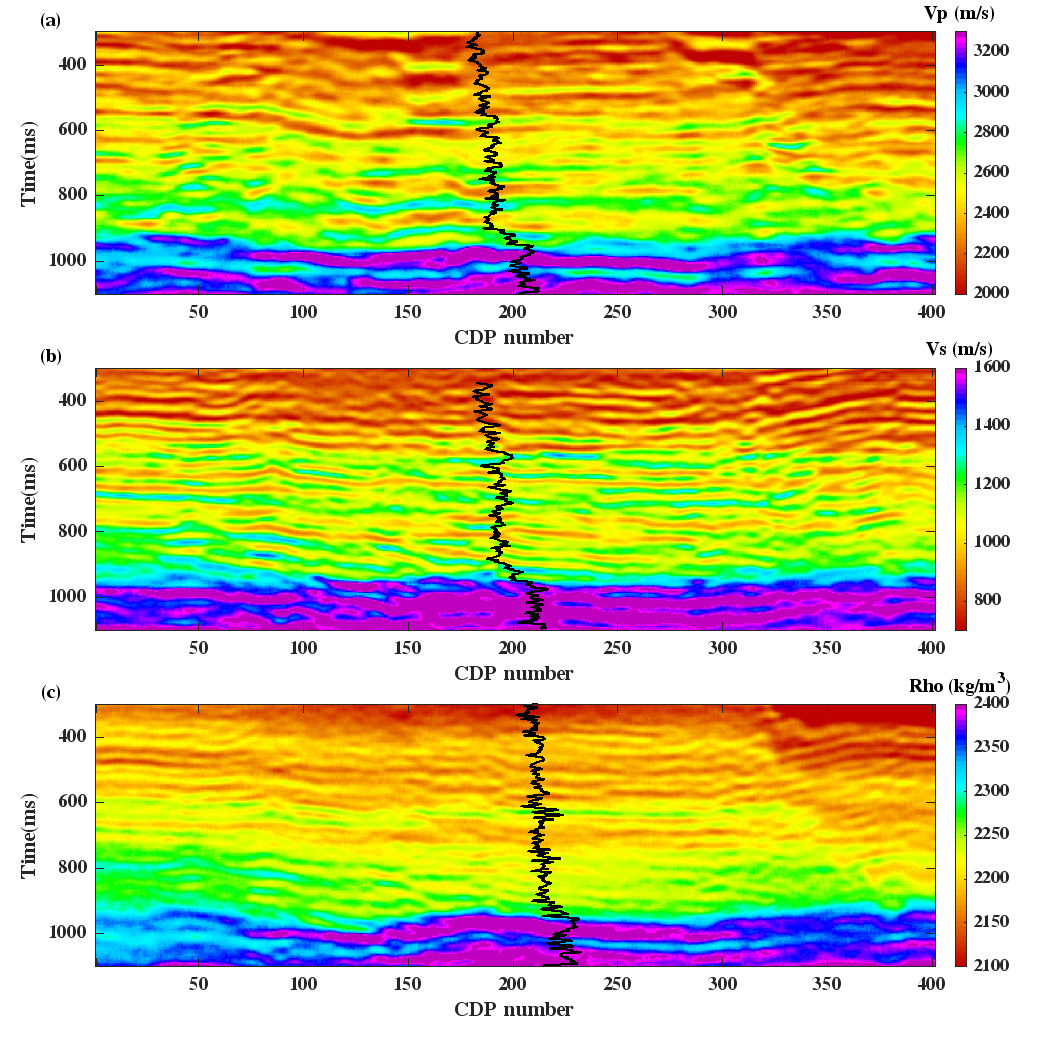 图2-图4所示为对来自中国东部某实际油田资料处理结果。分别对应基于L2范数正则化、L1范数正则化、振幅熵正则化的反演结果。每幅图从上至下依次为纵波速度、横波速度、密度反演结果;图中黑线为对应第203道的测井曲线。从反演结果不难看出,基于L2范数正则化的反演结果分辨率较低,反演剖面较为模糊。基于L1范数正则化的反演结果分辨率有所提升,但仍不及基于熵正则化的反演结果,与前两种正则化反演结果相比,基于熵正则化的反演结果分辨率较高,连续性较好,与测井曲线的变化趋势也较为吻合,证明了本文提出算法的有效性和实用性。