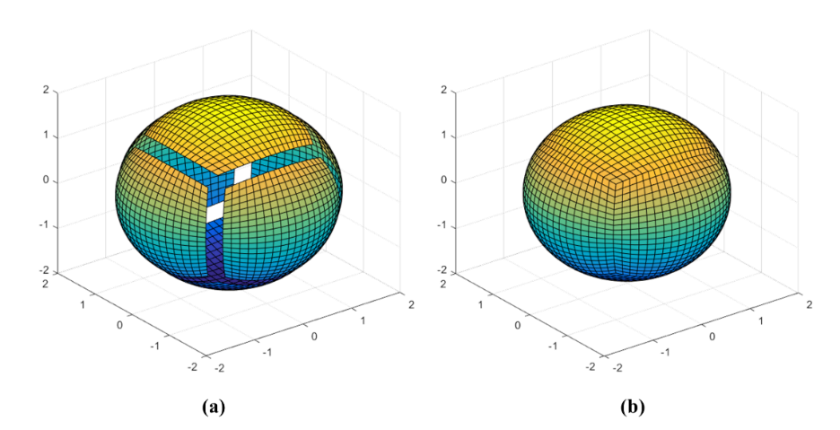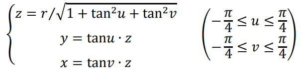 以Z轴正方向上的球面为例,设从X轴发射的平面与Z轴的夹角为u,从Y轴发射的平面与Z轴的夹角为v,根据X轴发射的平面与Z轴的夹角可以得到平面法向量,为X轴向量与平面在ZoY平面上的交点到原点向量之间的叉乘,解算两平面与球面的交点得到Z轴正方向上的曲面方程为: