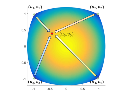 在四个顶点存储的视图中,对应相同坐标的像素颜色值ci会有一定差距。本研究使用距离场来描述插值点的视图颜色,通过顶点插值得到对应坐标上的颜色值,每个顶点对插值点颜色的贡献度与距离相关,且贡献度总和为1。则顶点贡献度表示为:
