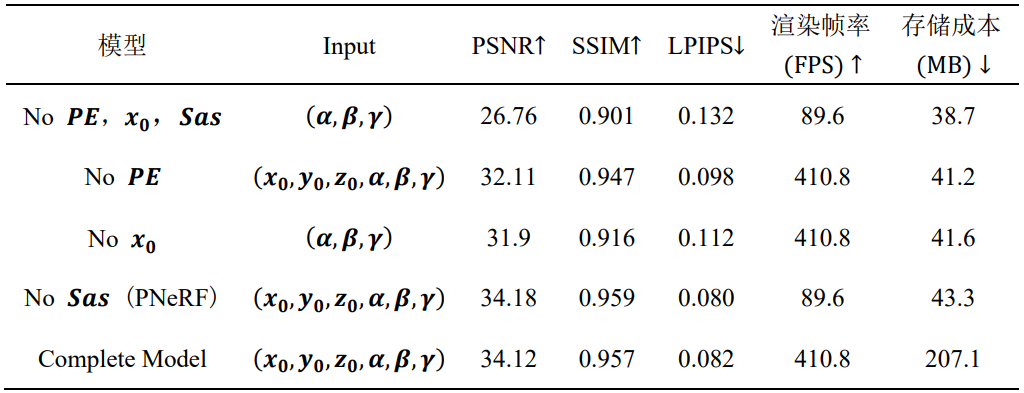 最后,在存储成本上的对比,如图6所示。PNeRF模型的存储空间大小仅仅只需保存网络权重的空间且渲染速率表现较优。