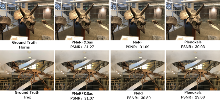 根据LLFF数据集来进行实验并评估本章节的算法。首先,在渲染质量上,如图6所示,展示了真实的360度场景Horns与Trex的渲染结果对比,渲染质量评估数值对比见表2。