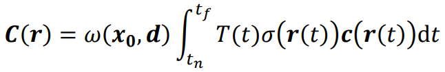 为了更好的反映颜色变化情况,对每条光线设置权重w(x0,d),权重w与观察位姿相关,表示为光线色彩RGB三通道分别对最终像素的贡献度,取值范围为[0,1],此外,每条光线的强度比例为一常数,为方便于计算,将其与权重混合在一起,即w(x0,d)表示光线色彩贡献度与强度的乘积,得到新的体渲染方程为: