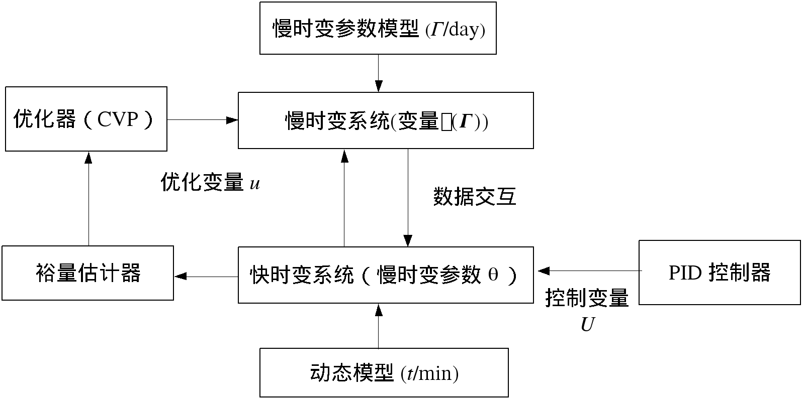 所表示的稳态变量上传到慢时变系统中。此外,涉及到裕量部分时,快时变系统的状态变量通过在线的裕量估计器,估计出相应的控制裕量和工艺裕量,再由优化器得到保证一定操作裕量的最优的优化变量。总体结构如图1所示。