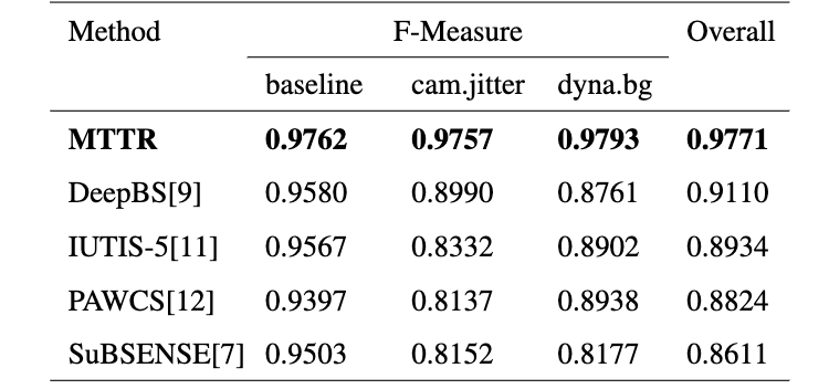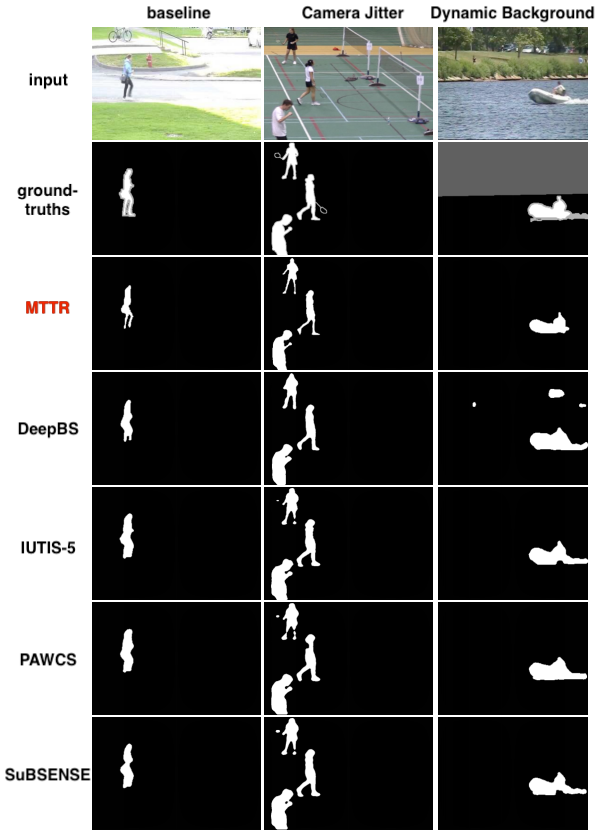 综上所述,将MTTR模型应用于背景减除任务不仅提供了一种新的方法,而且为视频分析领域提供了一个新的维度。预计未来的研究将继续这一轨迹,进一步推进对视频内容在不同和具有挑战性的背景下的理解和处理。