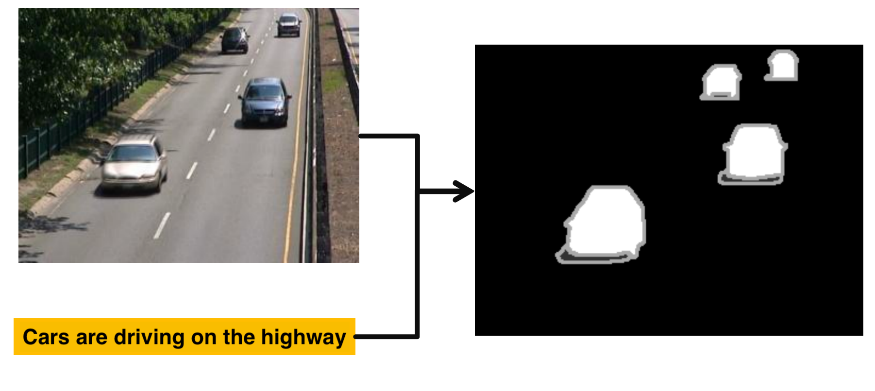 更重要的是,如图所示,为了充分利用MTTR模型的多模态特性,我们手动为每个视频添加视频标题,作为文本查询的一部分。这些视频标题简洁地描述了视频内容,如“汽车在高速公路上行驶”。通过将这些描述性文本信息与视频帧一起输入到模型中,MTTR可以更准确地理解视频内容,从而提高区分背景和前景的精度。视频标题的加入不仅丰富了数据集的信息内容,而且为模型提供了额外的语义层,有助于提高背景减除任务的性能。