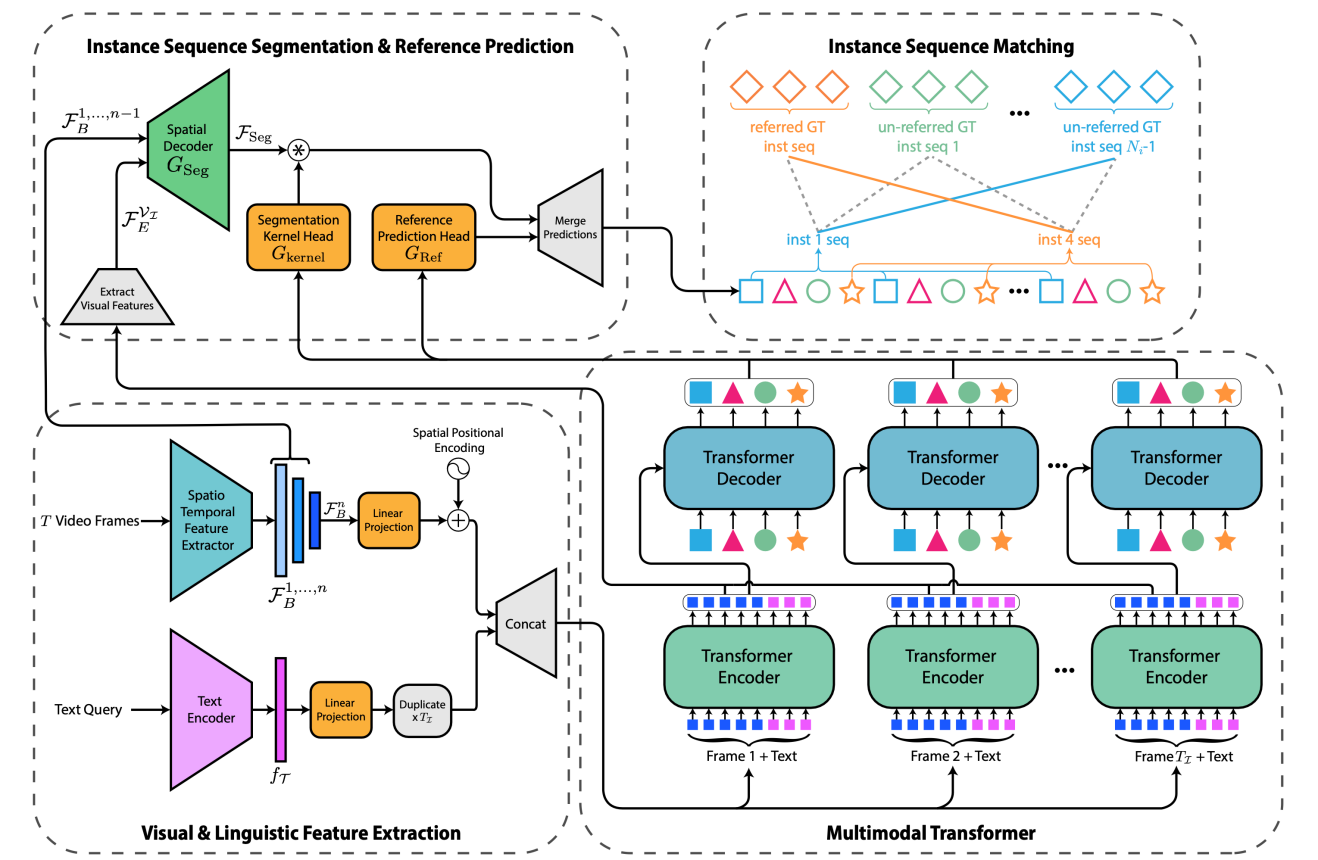 特征提取完成后,MTTR模型使用多模态Transformer进一步处理这些特征。通过其编码器和解码器结构,该Transformer实现了视频和文本功能的深度集成,利用自关注机制来探索不同模式之间的关系,并为每个对象实例生成独特的序列。在此过程中,视频中的视觉信息和文本中的语言信息被有效融合,为后续的分割任务提供了坚实的基础。