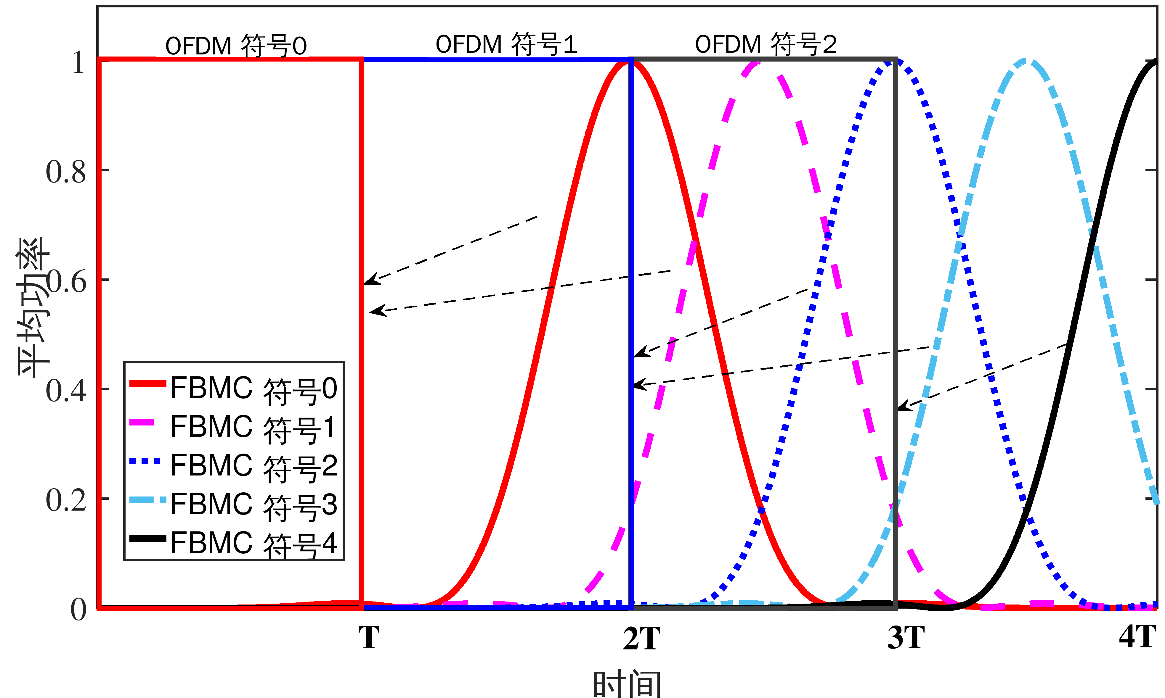 为直观的揭示FBMC符号间的重叠结构,在图1中同时画出OFDM符号和FBMC符号的功率分布轮廓。观察到以下三点:(1)OFDM符号的平均功率分布在当前符号周期T内,而FBMC符号的功率主要分布在延后的两个符号周期内,即区间[1T,3T]内;(2)每个FBMC符号主要与前面的两个符号和后续的两个符号发生重叠,特别是与前后两个符号重叠得较多;(3)当前FBMC符号的峰值不仅受之前几个符号的影响,还将受到后续几个符号的影响。这三点观察对FBMC系统中PAPR抑制方案的设计有重要指导作用。