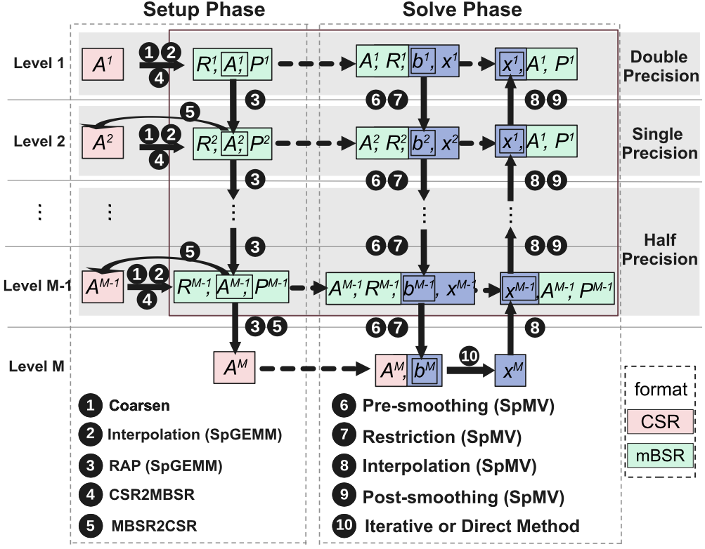 代数多重网格(AMG)方法因其灵活性和适应性,被广泛用于求解稀疏线性系统。尽管现代GPU为AMG提供了大规模并行计算能力,但其最新硬件特性(即Tensor Core及其低精度计算能力)尚未被很好的用于加速AMG。然而利用Tensor Core加速AMG面临着三个挑战:(1)存储方面,如何避免为SpGEMM和SpMV生成不同格式的矩阵;(2)计算方面,如何将一般稀疏结构与Tensor Core的严格稠密GEMM模式相匹配;(3)精度方面,如何将可变精度的SpGEMM和SpMV集成到AMG的完整数据流中。