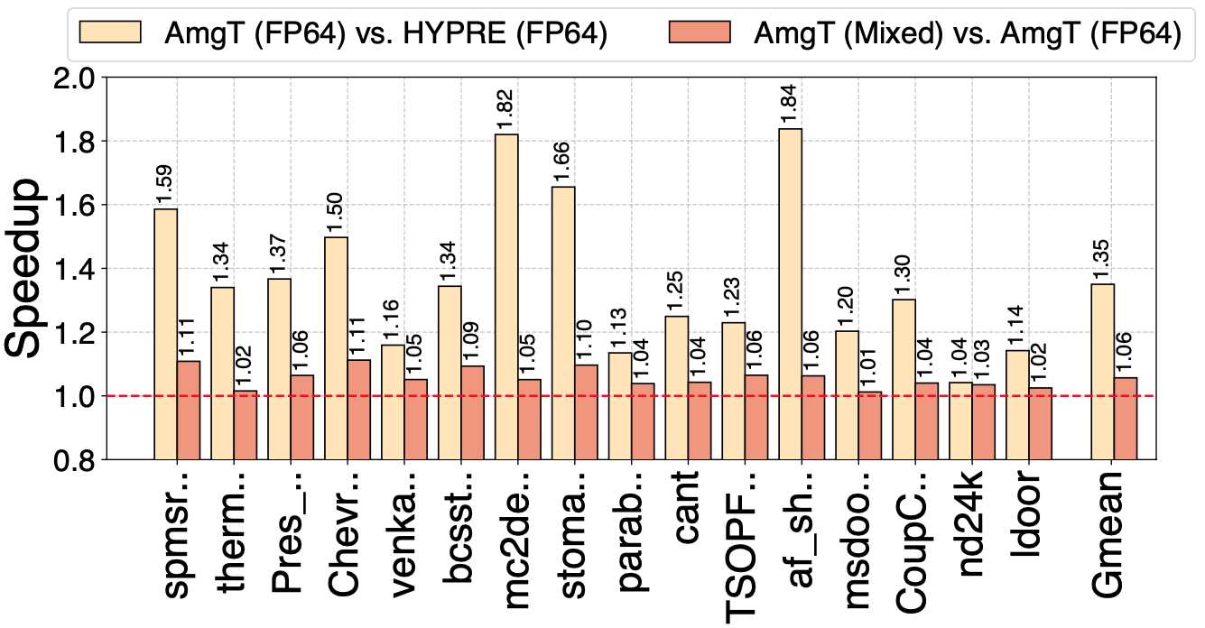 图5. HYPRE和AmgT在8个A100 GPU上的性能比较