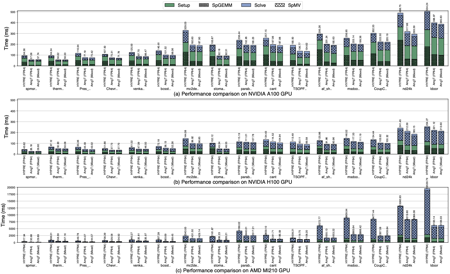 实验结果表明,在NVIDIA A100、H100 和AMD MI210 GPU上,AmgT比原GPU版本的HYPRE平均快1.46倍、1.32倍和2.24倍(最高达2.10倍、2.06倍和3.67倍),如图4所示。在A100和H100上,我们的混合精度AmgT比双精度AmgT分别快1.03倍和1.04倍(最高1.08倍和1.14倍)。此外,独立kernel测试表明,我们的SpGEMM比cuSPARSE和rocSPARSE SpGEMM分别快3.09倍、2.40倍和4.67倍(最高达7.61倍、6.11倍和5.96倍),SpMV在三个GPU上的性能分别是cuSPARSE和rocSPARSE SpMV的1.34倍、1.19倍和2.92倍(最高达2.21倍、2.09倍和6.70倍)。