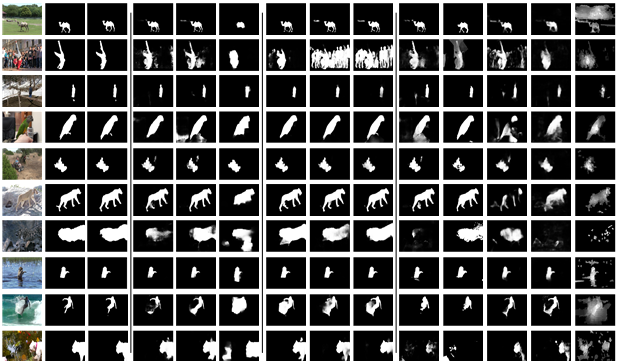 图1 图像和视频显著目标检测方法在静态图像和视频序列上的可视化对比结果示意图