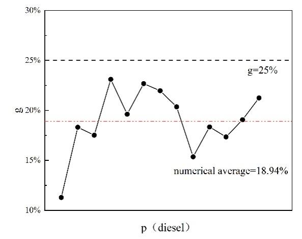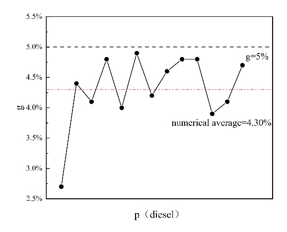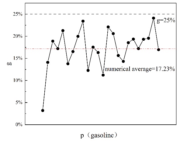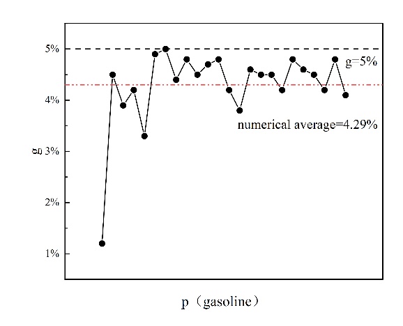 通过分析具有不同设定差距值 g 的原油调和方案,当设定差距值 g = 5% 时,参与调和的原油种类较少,大多数原油调和方案仅根据实时原油购买价格调整不同原油类型在调和过程中的比例,很少替换新的原油类型。在这种情况下,调和原油的性质波动最小且最稳定。当设定差距值 g = 15% 时,参与调和的原油种类明显多于 g = 5% 的情况。原油调和方案频繁调整,参与调和过程的原油种类和比例不断变化,调和原油的性质在一定范围内频繁波动。在 g=25% 时,参与调和过程的原油种类略多于 g=15% 的情况,但原油调和方案的变动更大,即不同调和方案的变动更多,原油种类和比例的变动也更多,导致调和原油性质的波动最为显著。这表明,我们可以通过调整设定值 g 的大小来影响调和原油性质的波动范围,从而稳定调和原油的性质。设定值 g 越小,性质波动的范围越小,调和原油的性质越稳定。