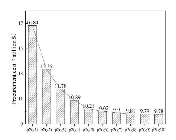 虽然较小的设定值 g 能够使实际过程中调和原油的性质更加稳定,但仅关注调和原油性质的稳定性是不够的;模型还需要考虑原油采购的成本。当设定差距值 g = 15% 时,案例1-4的原油采购成本如图5所示。