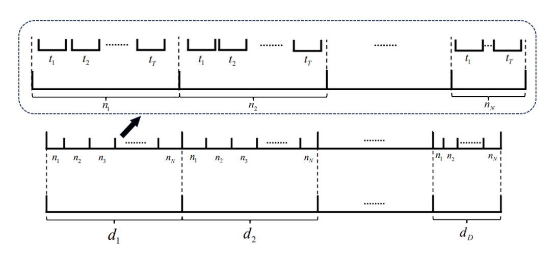 对于本文提出的集成优化问题,我们采用连续时间表示法来表示原油调和调度,采用基于事件的表示法来表示原油采购计划,以此来解决集成模型中采购计划和调和调度时间尺度的差异问题。我们将上述的表示方法命名为混合事件-连续时间表示法。图1展示了集成优化问题的混合事件-连续时间表示法。我们提出这种混合事件-连续时间表示法,主要是基于以下考虑:采购规划和调和调度的时间尺度不一致且变化范围广泛。采购计划通常以月度为单位进行,而调和调度则每小时进行一次。如果将采购规划与调和调度放在同一时间尺度上考虑,将会产生过多的时间间隔和潜在的巨额计算成本。因此,在我们提出的方法中,采购计划由事件表示,区间是基于事件而不是小时,这意味着区间被定义为事件开始和结束之间的时间段。定义时间区间的事件可以是(1)原油的到达和/或(2)订单要求下调和配方的更改。连续时间表示法表示每个事件的详细原油调和操作计划。