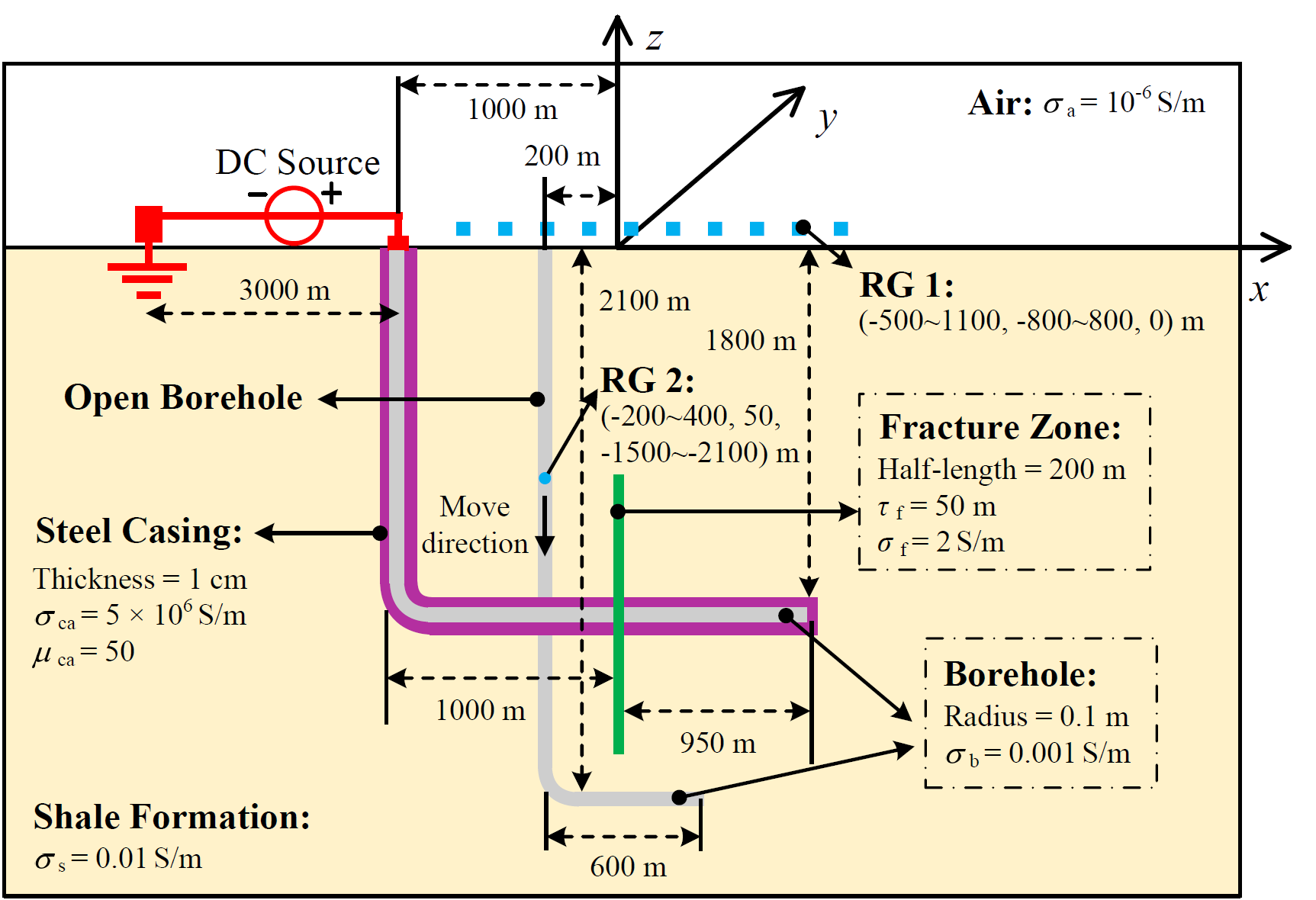 水力压裂是能源开采中的一种关键方法,特别用于提高致密油藏中的石油回收率,并改善地热资源的热效率。由于页岩地层的电导率低于电支撑剂裂缝带,一些学者依赖电磁学发展了多种测井技术,旨在准确描绘裸眼井中的水力裂缝特征。然而,当在套管井中运用这些技术时,情况就变得更为复杂。这是由于常见的磁性钢套管材料具有显著的导电性,会造成透射电磁场严重衰减。基于上述背景,一些学者认为电流测量是获取关键数据(例如地层边界和储层中的油气饱和度)的有效手段。然而,这些方法往往伴随着微弱信号的产生,这些信号极易被背景噪声所掩盖,从而大大增加了准确识别裂缝带信号的难度。因此,我们考虑采用近场监测方法来提高裂缝带的可监测性。