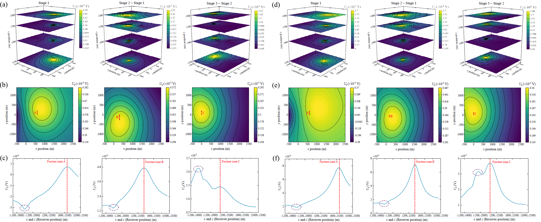 图1显示了验证模型的二维横截面,图2显示了响应结果。不难发现在压裂前信号幅值随着靠近套管井眼而增加,然而压裂后,信号振幅整体增加,并且接收器水平移动时可以观察到压裂带的峰值信号。通过比较压裂前后的电位差,我们可以识别出峰值和谷值,分别表示裂缝带沿z轴和x轴的信号强度。跨井测量方法的信号幅度比井地测量方法大3个数量级,显著提高了裂缝带的可监测性。因此,跨井测量方法对于监测水力裂缝是可行的,并且可以为电流测量提供令人信服的结果。图3显示了不同参数下对称裂缝带的电位响应,图4显示了复杂地质和井眼条件下的电位响应,图5显示了分段压裂带的电位响应。