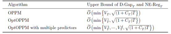 我们提出了解决OSP(The Online Saddle Point)问题的近点法的三种变体:在线近点法(the Online Proximal Point Method,OPPM),乐观OPPM(the Optimistic OPPM,OptOPPM)允许任意预测器,OptOPPM具有多个预测器,增强了算法处理多个预测器的能力。结果如表1所示。