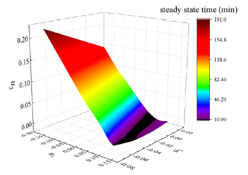 图3.系统离线仿真图(每个点都是稳态工作点,以及从初始时刻到稳态工作点的时间)。
