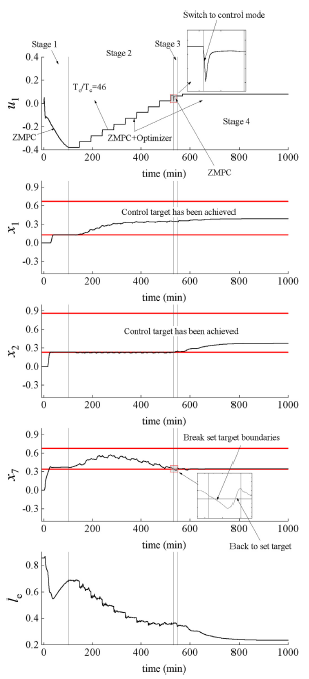 数值实验表明,本文提出的并行结构优化策略是可行的。 在实际应用中,应注意选择优化器的采样周期和冗余间隔。 在该实验中,由于冗余间隔太大,因此第二阶段的系统状态超出了控制目标。 因此,当设计冗余间隔时,可以适当地减小它以获得更稳定的控制性能。