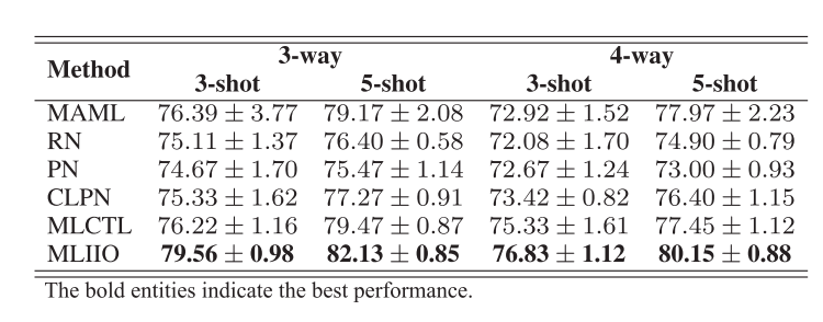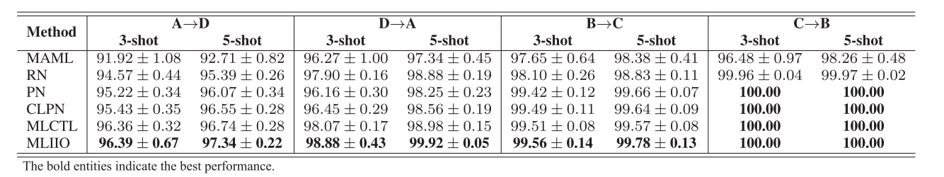 为验证所提方法的有效性,在公开CWRU轴承数据集上对比了多种代表性方法(MAML、RN、PN、CLPN和MLCTL),结果表明所提出的元学习方法在小样本故障诊断的平均诊断精度方面更加出色。在3-way 5-shot设置下,所有方法的平均诊断准确率超过了90%,这表明即使在样本数量有限的情况下,MLIIO方法也能学习到有效的特征表示。在其他设置下,平均准确率也大多在80%到90%之间,显示了该方法在少样本学习问题上的鲁棒性。